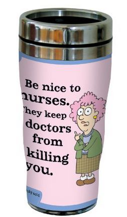 7. Nurses can take their hot beverages on the go with this humorous Stainless Steel Travel Mug by Auntie Acid.