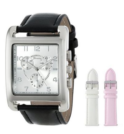 16.Geneva Women’s 2377 Silver-Tone Square Oversized Watch Set with Three Interchangeable Faux-Leather Straps