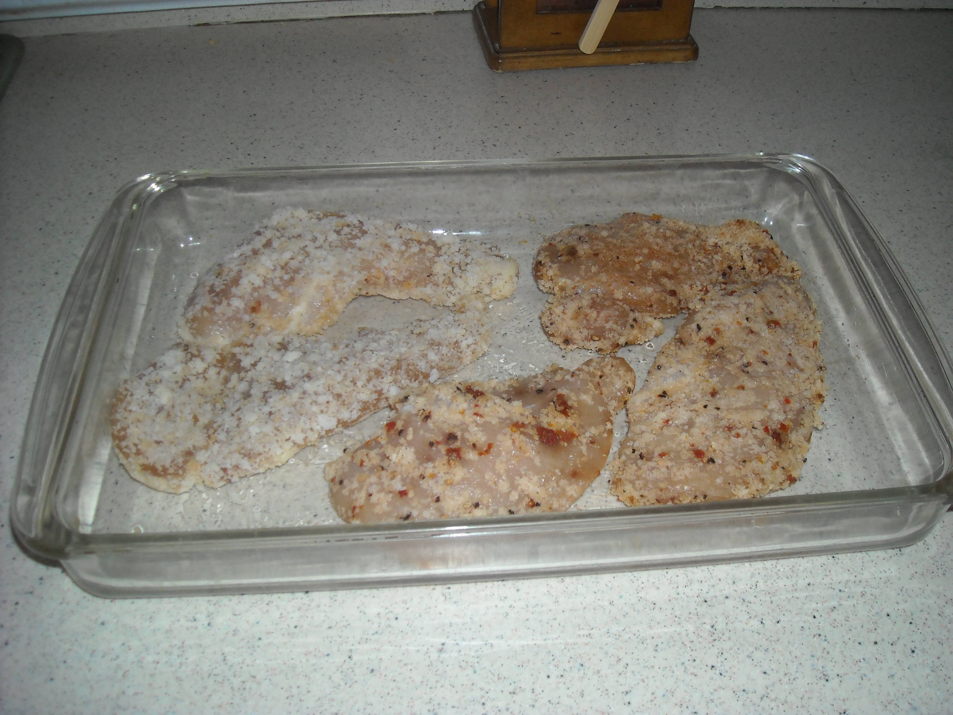 I actually found Panko breaded chicken cutlets pre-made and marked down at my local grocery store (score!).  You can also buy these bread crumbs.  Simply take the chicken breasts, pound them with a meat mallet (unless you are using chicken tenders), drip them in milk and roll them in the Panko bread crumbs.
