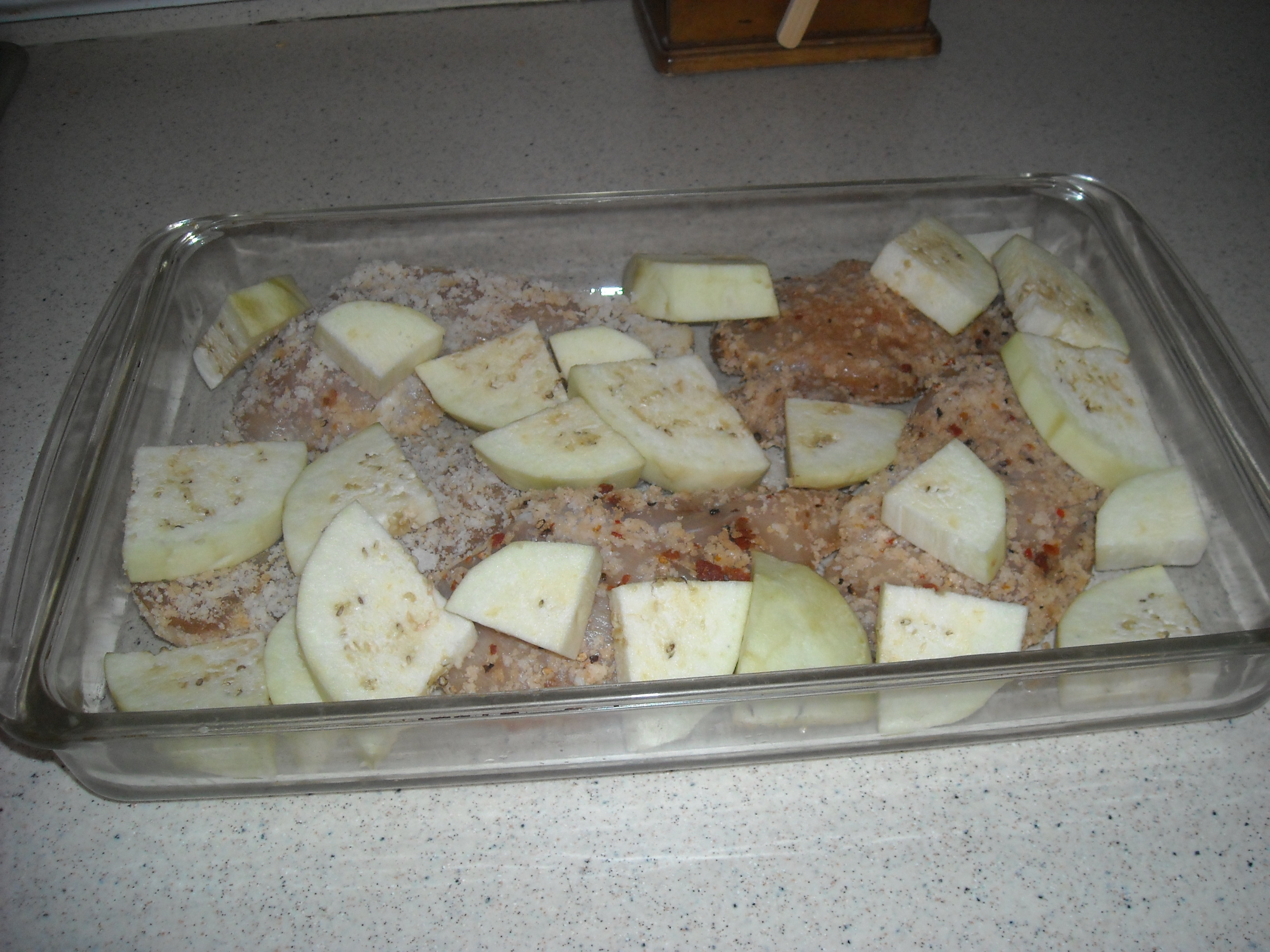 5. Place the eggplant into the baking pan on top and in between the chicken (see graphics below)