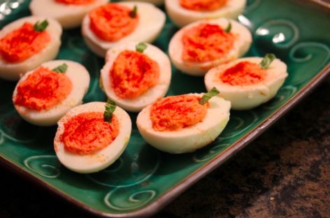 1. Halloween Deviled Eggs: Make them clean eating with greek yogurt, spicy mustard, and seat salt. Orange dye makes them orange.