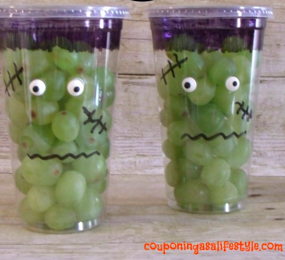 6. Frankenstein Fruit Cups: Grapes and blueberries in a fun single serving sized cup.