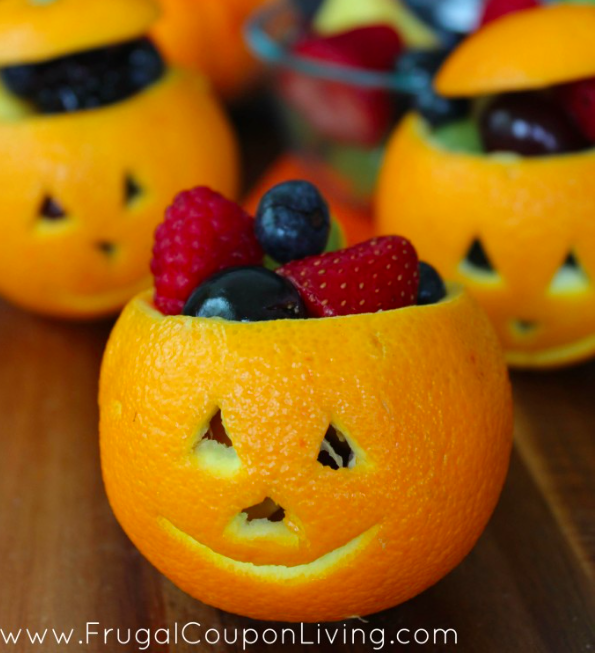 7. Jack-O-Lantern Fruit Cups: Carved oranges and any fruit mix are another way to make fun single serving snacks for any party.