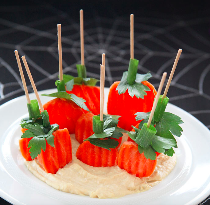 8. Hummus Pumpkin Patch: Carrots with ridges can be bought where you buy bagged baby carrots. Such a cute and easy snack.