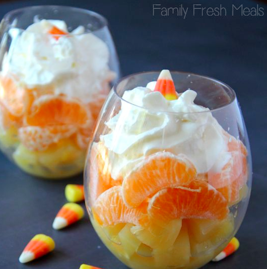 11. Candy Corn Fruit Cups: Pineapple, mandarin oranges, and low fat whipped cream (or make your own), candy corn as garnish on top