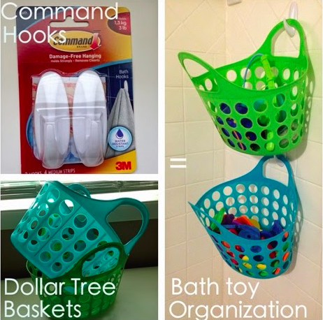 Bath Toy Baskets: These baskets can be found at the The Dollar Tree. You could hook these over a shower curtain of use Command Hooks. Cost: $2-$5