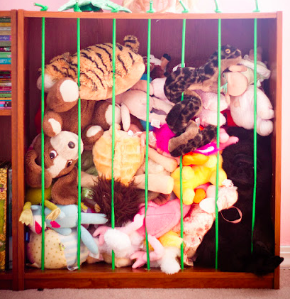 Animal Cage: Here is another great stuffed animal idea. This is simply made from an old book shelf. Use one you have around the house or pick up a cheap one at a yards sale for a couple dollars. Then pick up some bungee cords at a local hardware store. Cost: up to $10