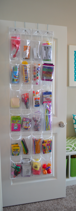 Hanging Door Organizer: Normally these products are used to shoes, mittens, etc. However as you can see they work well for art supplies as well. You can also use them for Barbies, cars, and more. Sometimes you can even find these at Dollar stores. Cost: $1-$5