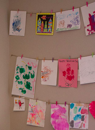 Artwork Display: Twine, screws, and mini-cloth pins are an easy way to display artwork and you can easily switch it out to make room for new projects. Cost: $3-$5