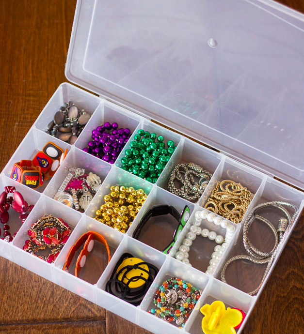 Dress-Up Jewelry Organizer: These boxes can be found at any craft store. Use a 40% off coupon that Michael’s Jo-ann’s and other stores regularly make available on regular priced items. Cost: $2-$5