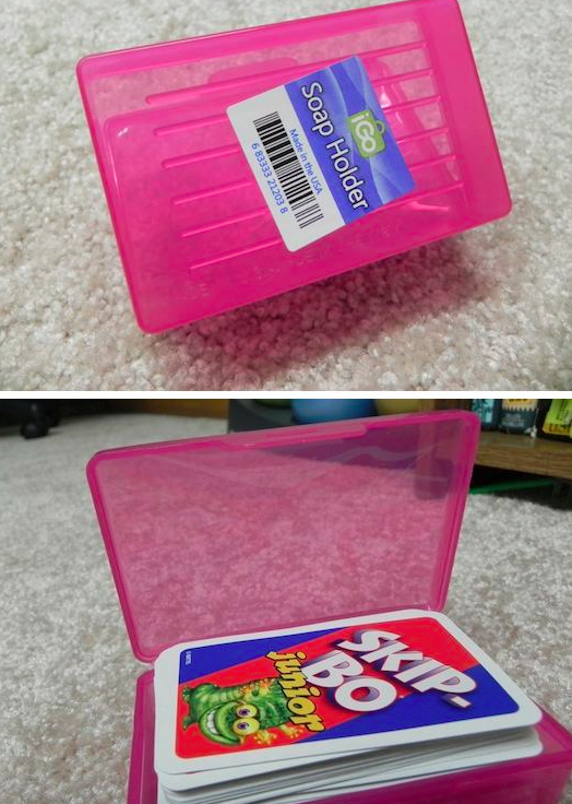 Soapbox Playing Cards Storage: These soap boxes can be found at The Dollar Tree. As you can see they are the perfect size to fit sets of playing cards. Cost: $1