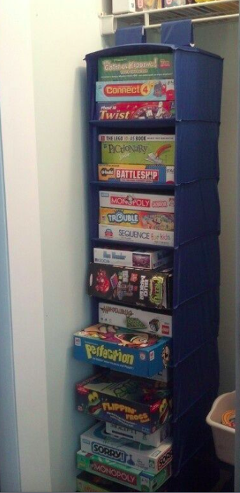Board game storage. Sweater and shirt closet organizers can be used at board game holders. These can be found at Walmart or Target. I have also found some at Goodwill as well. Cost: $3-$10