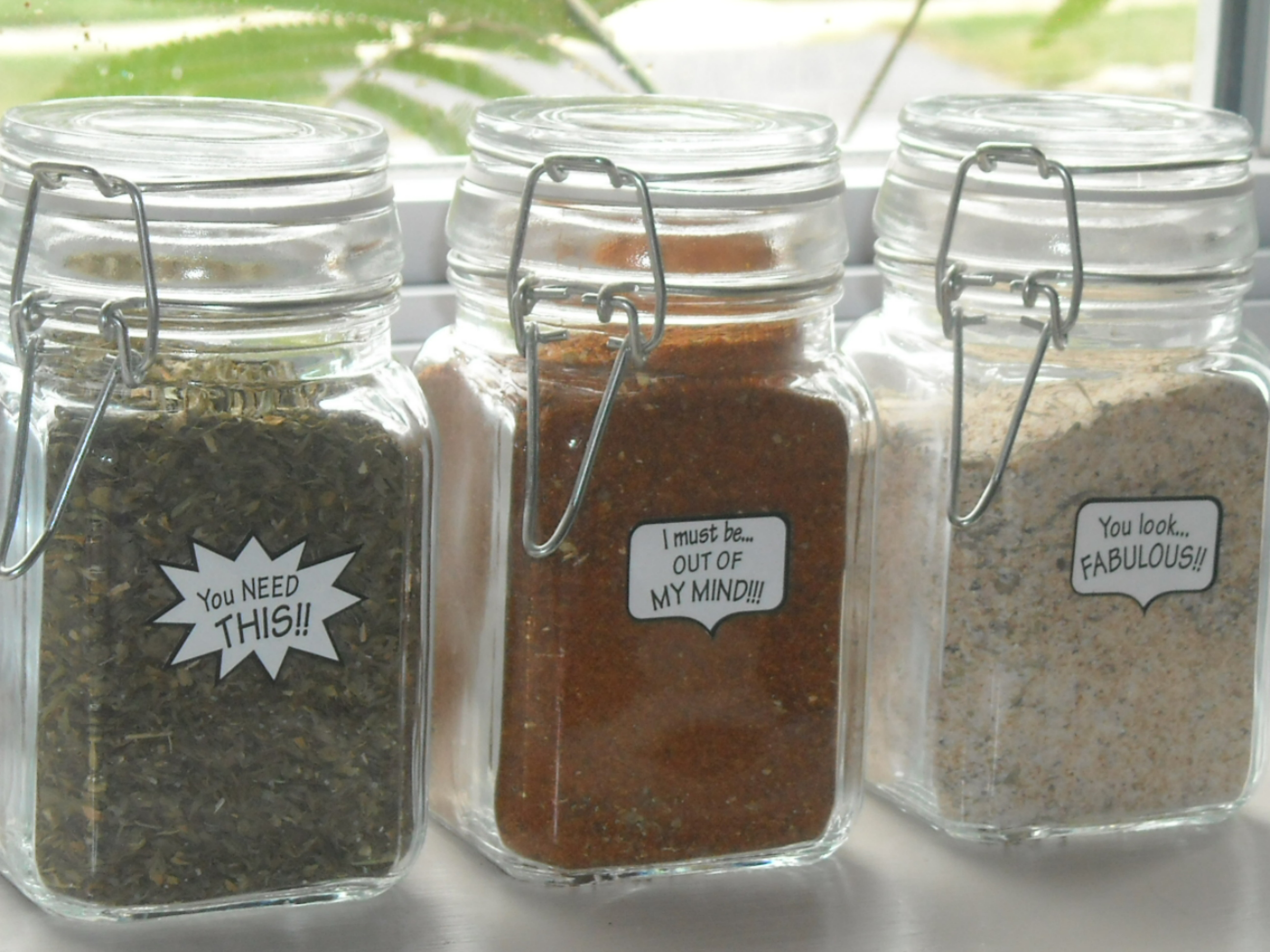 I didn’t have labels, so one of my best friends (who was with me at the time) and I decided to use some word bubbles stickers from my scrapbooking stash. Because the colors are so different, it’s not hard to figure out which is which seasoning. However it was fun to be a smartypants!
