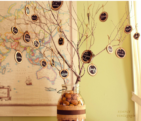 Thankful Tree: This is so easy to make with branches, a jar, stones, and scrapbook paper or ribbon as a decoration. You can purchase tags at the Target One Spot for guests to write on.
