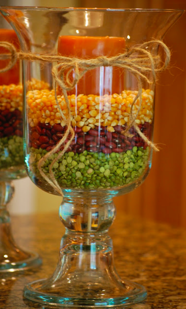 Hurricane Lamp Centerpiece: Place a candle in the lamp and layer with difference colored beans and popping corn.
