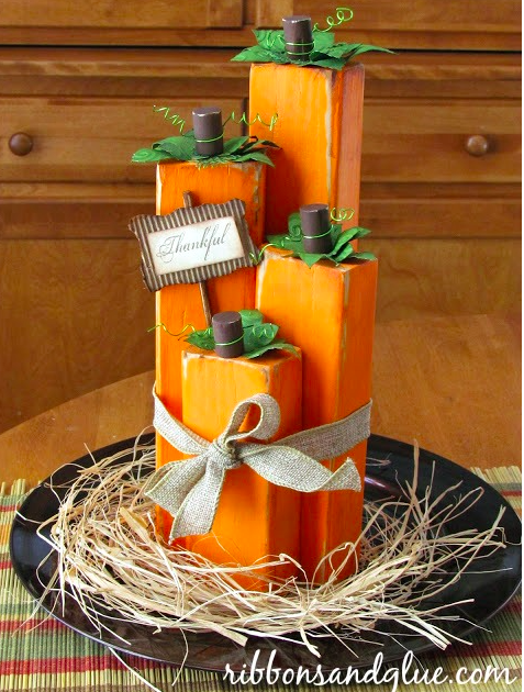 Wood Block Pumpkins: Wood, blocks, paint, glue, and a few extras make this cute centerpiece. Plus kids could help make this one.