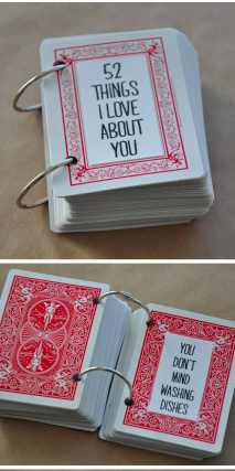 52 Things I Love About You: My kids and I made this gift for my husband one year. All you need a deck of card, a whole punch, and metal rings (or ribbon).  The kids helped me compile a list of things we love about their dad.  Then I just typed them up, printed them out, cut them, and glued them to the card.  This is one of his all-time favorite gifts.