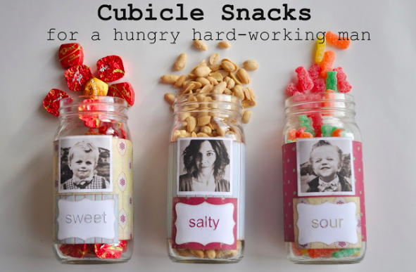 Cubicle Snack Jars:  I love this idea!  You purchase three different jars and pick snacks that are sweet, salty, and sour.  The best part is the pictures of the kids on the jar.  Notice their expressions.  One child looks sweet, another looks salty (sassy), and the other one is making a “sour” face.  So fun!