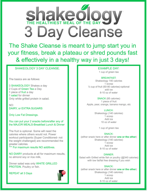 - The Shakeology 3-Day Cleanse involves: 3 Shakeology drinks per day as well as 800-1100 calories of fresh fruit, vegetables, and lean proteins. See the graphic below to see what I’m getting myself into: