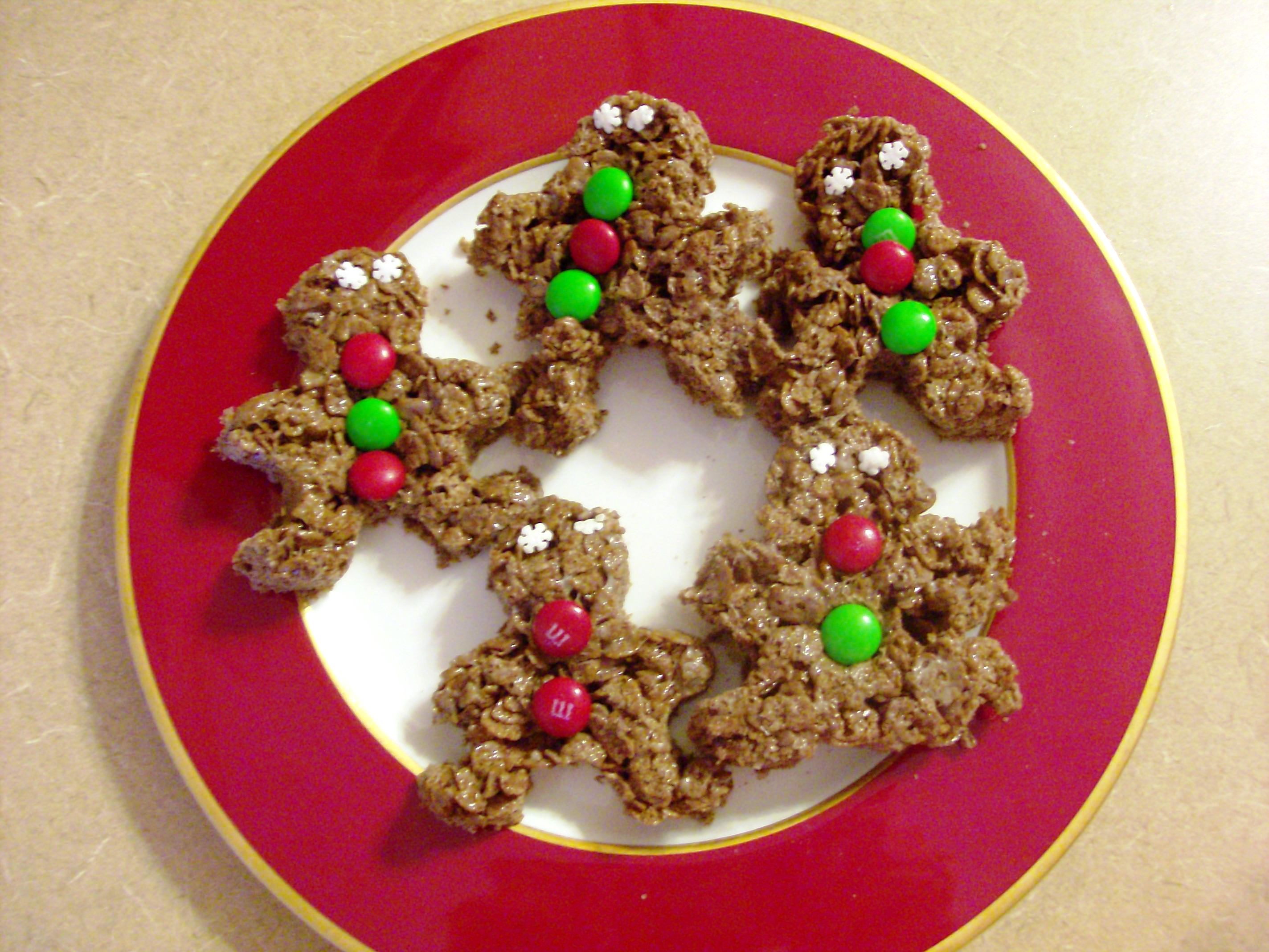 Instead of using them with Rice Krispies, I used Post Cocoa Pebbles cereal to make these yummy chocolate mint treats. We cut out gingerbread men shapes using a cookie cutter, and the kids helped decorate them with holiday M&Ms and snowflake sprinkles. If you like the combination of chocolate and mint, you will LOVE these treats!