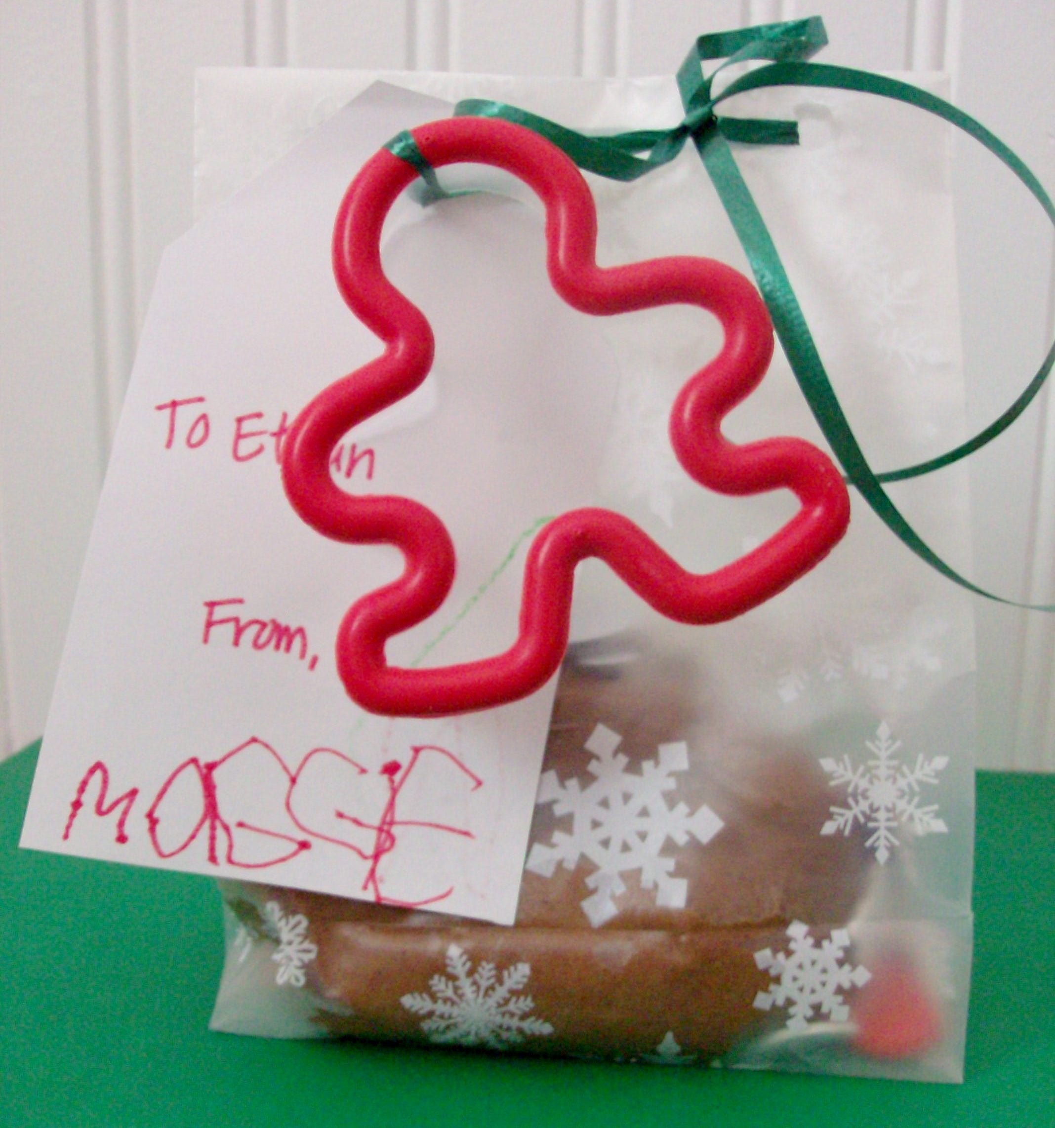 Here is the homemade play dough recipe I’ve been using lately. If you have your own favorite homemade play dough recipe, use it to make gingerbread play dough by mixing in 2 tablespoons cinnamon and 1 tablespoon ginger for every 2 cups of flour. Another idea for giving homemade play dough as a gift for Christmas is to make candy cane play dough with red food coloring and peppermint extract.