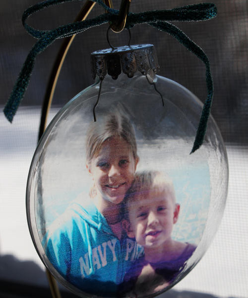 Photo Craft: Transparency Ornaments  Here is an easy-yet-frugal keepsake ornament idea that uses one of your favorite family photos in a creative way.  These clear glass ornaments can be purchased for around $1 each at store like Michaels Craft Stores or Joann Fabrics.  They make a fun gift for grandparents or far-away aunts and uncles.