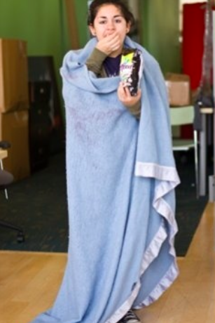Night-In Costume: Pajamas, hair up, blanket, and bag of popcorn. You could also add a hydrating face mask for an added detail. *photo originated from collegephoto.com.