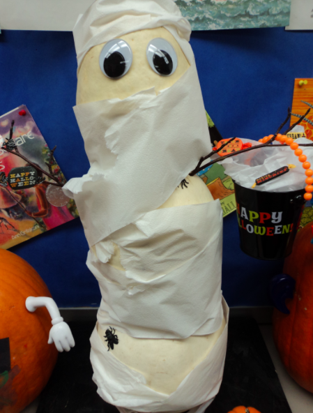 4. Pumpkin Mummy Stack: This can easily be done with pumpkins of any size shape so it’s a very fun and frugal way to create a fun Halloween decoration.