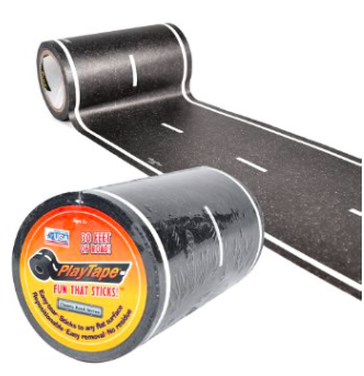 Road Tape: This tape allows kids to create their own road track. It gently sticks to any floor surface. This roll is 4 inches across and 30 feet long and fits a variety of small cars and trucks.