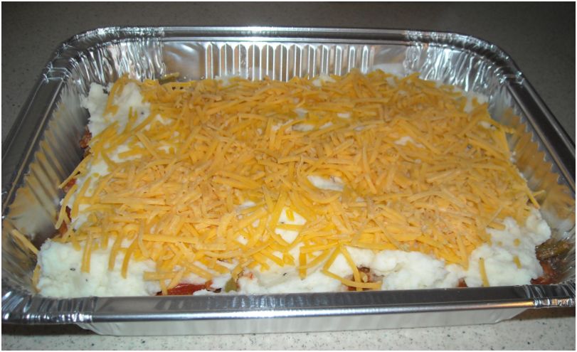 2. In the meantime, combine ground turkey, green beans, tomatoes, and pasta sauce. Divide evenly into 2 rectangular foil pans and spread until the entire bottom is covered.