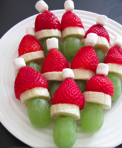 Grinch Fruit Kabobs: This is so easy! All you need is toothpicks, greek grapes, banana slices, strawberries, and mini marshmallows.