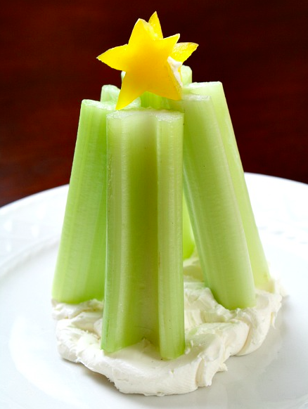 Celery Christmas Tree: This is another fun way to present a healthy snack. Put a dollop of cream cheese or peanut butter on a plate and top with 4 pieces of celery as you see in picture. Then cut a piece of pineapple and yellow pepper into the shape of a star. So fun!